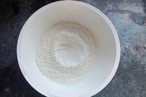 - Mehl, Zucker und Salz in eine große Schüssel geben und miteinander vermischen.