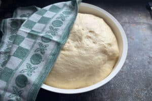 - Die Teigkugel mit Folie oder einem feuchten Geschirrtuch abdecken und an einem warmen Ort gehen lassen, bis sich das Volumen verdoppelt hat.
