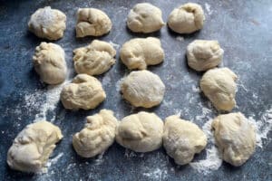 Nach der Gehzeit teilt man den Teig in gleichmäßige Portionen und formt ihn zu kleinen, runden Kugeln. Diese ruhen noch einmal, damit sie schön locker bleiben. Mit leicht geölten Händen ziehst du die Kugeln anschließend vorsichtig auseinander, bis die typische Form mit dünner Mitte und dickerem Rand entsteht.