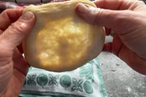 Beim Ausziehen selbst braucht es etwas Gefühl. Wird der Teig zu hastig oder mit zu viel Druck bearbeitet, reißt er leicht ein. Und wenn die Teigfladen zu dick bleiben, entsteht nicht die typische Form mit dem dünnen Mittelteil.