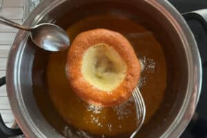 - Die geformten Teigfladen portionsweise vorsichtig in das heiße Fett in den Topf geben. Die Ausgezogenen von jeder Seite etwa 3 Minuten im heißen Fett frittieren, bis sie gleichmäßig goldbraun ausgebacken sind. Das Fett ist heiß genug wenn sich an einem Holzlöffel Bläschen bilden.