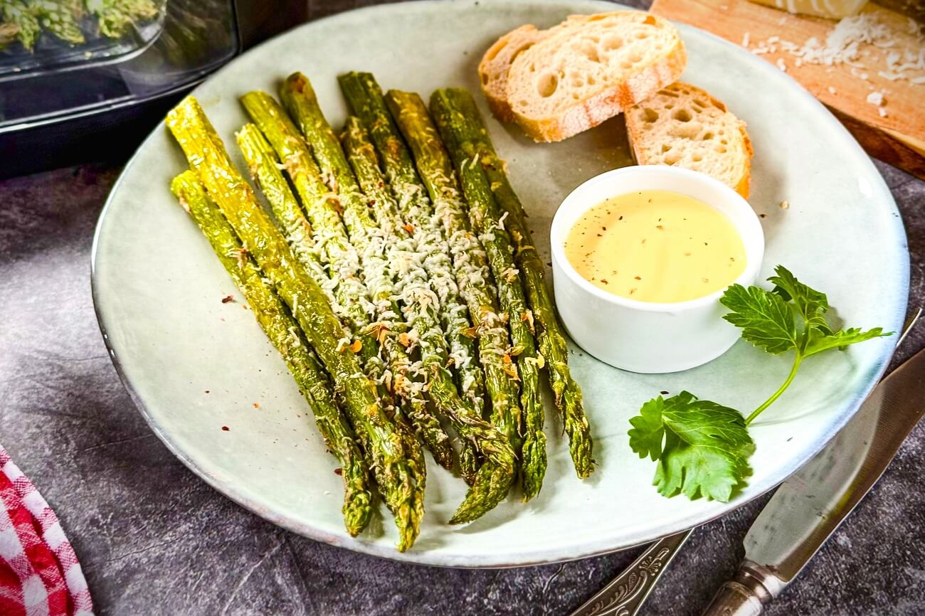 Spargel im Airfryer zubereiten: Mit Öl, Gewürzen & Parmesan gelingt grüner Spargel in wenigen Minuten – mit Röstaromen und bissfester Struktur.