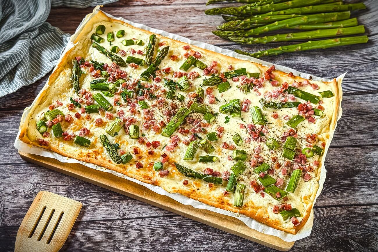 Flammkuchen mit Spargel ist ein schnelles Rezept das perfekt fürs Abendessen mit der Familie passt. Gelingsicheres Gericht für den Backofen!