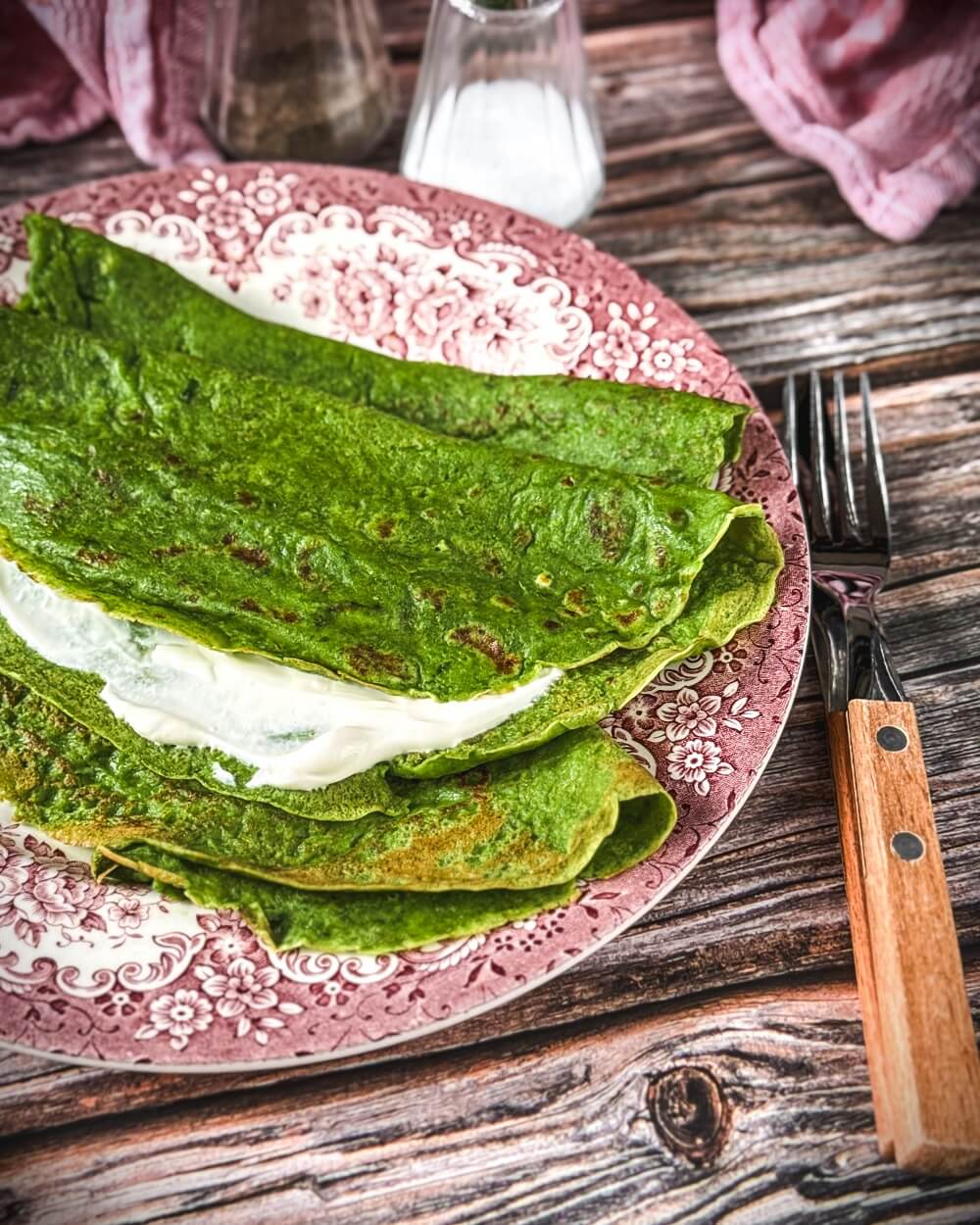 Der klassische Pfannkuchenteig bekommt bei diesem Rezept durch die pürierte Bärlauchmilch nicht nur seine grüne Farbe, sondern auch ein angenehm kräftiges Aroma. Dazu passt ein schneller Dip auf Basis von Creme fraiche, der die Würze ergänzt und das Ganze abrundet.