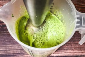 - Die Milch zusammen mit dem Bärlauch in ein hohes Gefäß wie den Rührbecher geben und mit dem Mixer fein pürieren, bis keine Stücke mehr sichtbar sind.