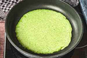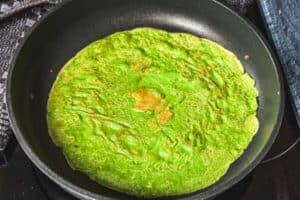- Eine Pfanne erhitzen, etwas Öl oder Butter hineingeben und eine Kelle Teig in die Pfanne geben. Den Teig gleichmäßig verteilen und bei mittlerer Hitze ausbacken.