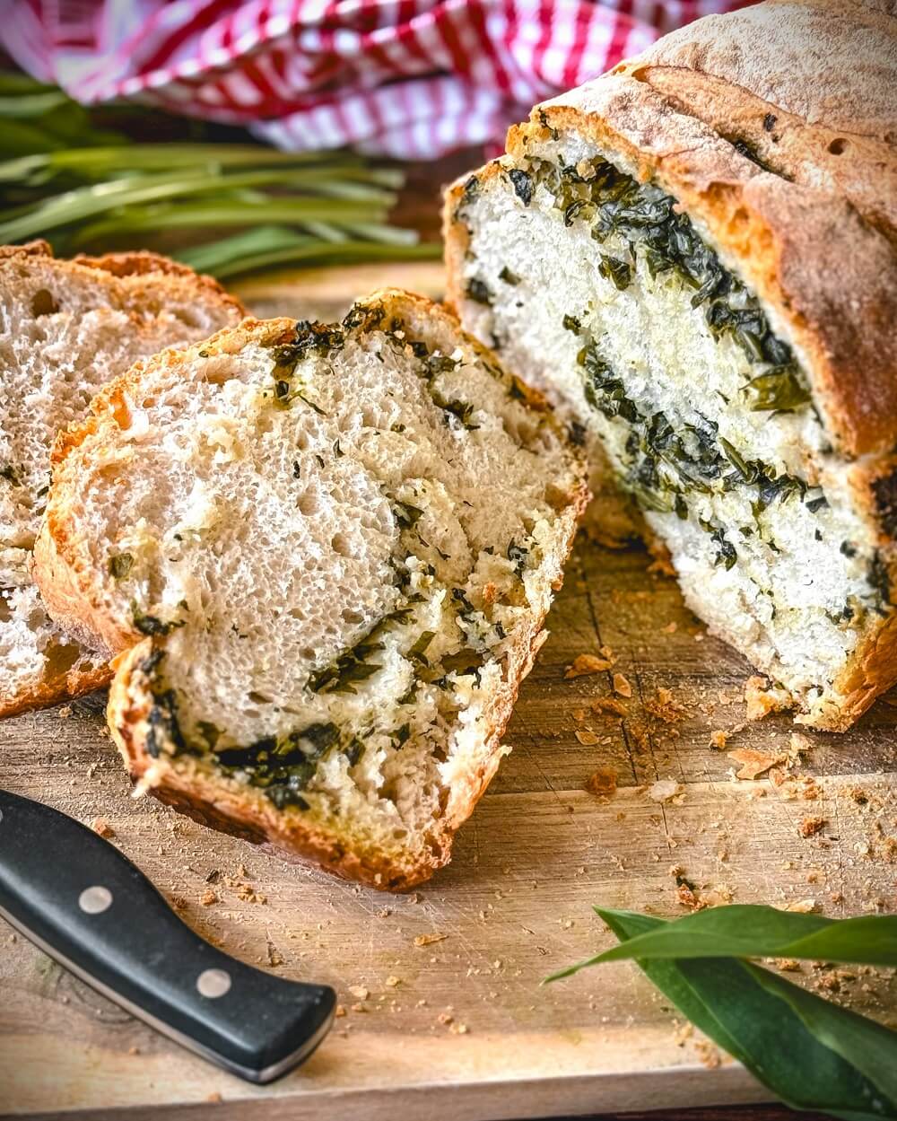 Wenn ich das Bärlauchbrot anschneide, ist für mich immer der erste Moment entscheidend. Außen kracht die Kruste richtig hörbar, während das Messer durchgeht, und innen ist das Brot schön weich und locker. Genau dieser Kontrast macht für mich den Unterschied.