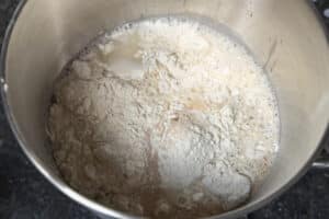 • Mehl, Salz und Trockenhefe in einer großen Schüssel gründlich vermengen.