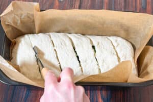 • Das Bärlauch Brot vor dem Backen mit einem scharfen Messer oder einer Rasierklinge einschneiden und zunächst 40 Minuten in der Form backen.