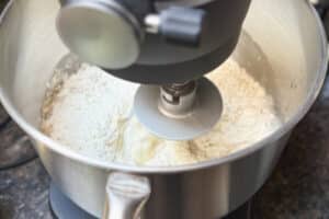 • Das lauwarme Wasser nach und nach zugeben und alles mit den Knethaken eines Handrührgeräts oder der Küchenmaschine etwa 10 Minuten kneten.