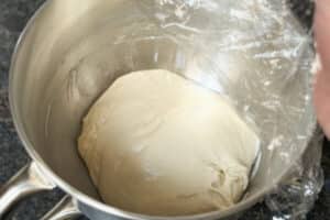 • Sobald ein glatter, leicht klebriger Teig entstanden ist, diesen mit Frischhaltefolie abdecken und an einem warmen Ort etwa 90 Minuten gehen lassen, bis sich das Volumen deutlich vergrößert hat.