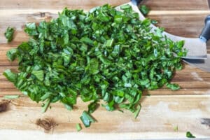 • In der Zwischenzeit den Bärlauch waschen, sorgfältig trocken tupfen und fein hacken.
