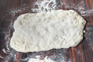• Den aufgegangenen Teig auf eine leicht bemehlte Arbeitsfläche geben, kurz durchkneten und zu einem Rechteck formen.