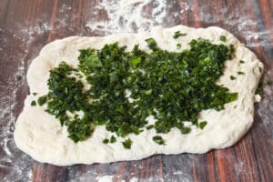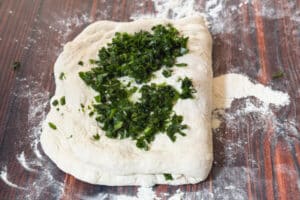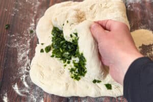 • Den Teig erneut flach drücken, den restlichen Bärlauch darauf verteilen und wieder einschlagen, bis die Kräuter eingearbeitet sind.
