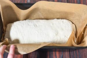 • Eine Backform mit Backpapier auslegen, den Teig hineinlegen und abgedeckt weitere 20 Minuten ruhen lassen. Währenddessen den Backofen auf 220 Grad Ober Unterhitze (200 Grad Umluft) vorheizen.