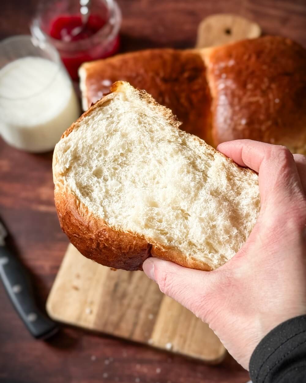 • Milch: Lauwarme Milch sorgt dafür, dass die Hefe gut arbeiten kann und der Teig schön geschmeidig bleibt. Sie bringt außerdem eine leichte Milde und unterstützt die weiche Krume.