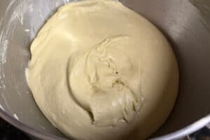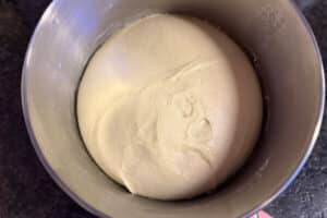 • Alle Zutaten für den Teig in eine Rührschüssel geben und mit den Knethaken der Küchenmaschine auf mittlerer Stufe 15 bis 20 Minuten ohne Unterbrechung kneten.