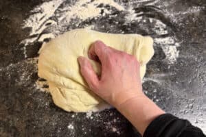 • Den Teig danach auf eine leicht bemehlte Arbeitsfläche geben und sorgfältig durchkneten.