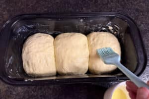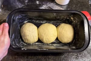 Jedes dieser Teigstücke  zu einer glatten Kugel formen. Diese Teigkugel wandern in die vorbereitete Backform, wo sie ein zweites Mal aufgehen.