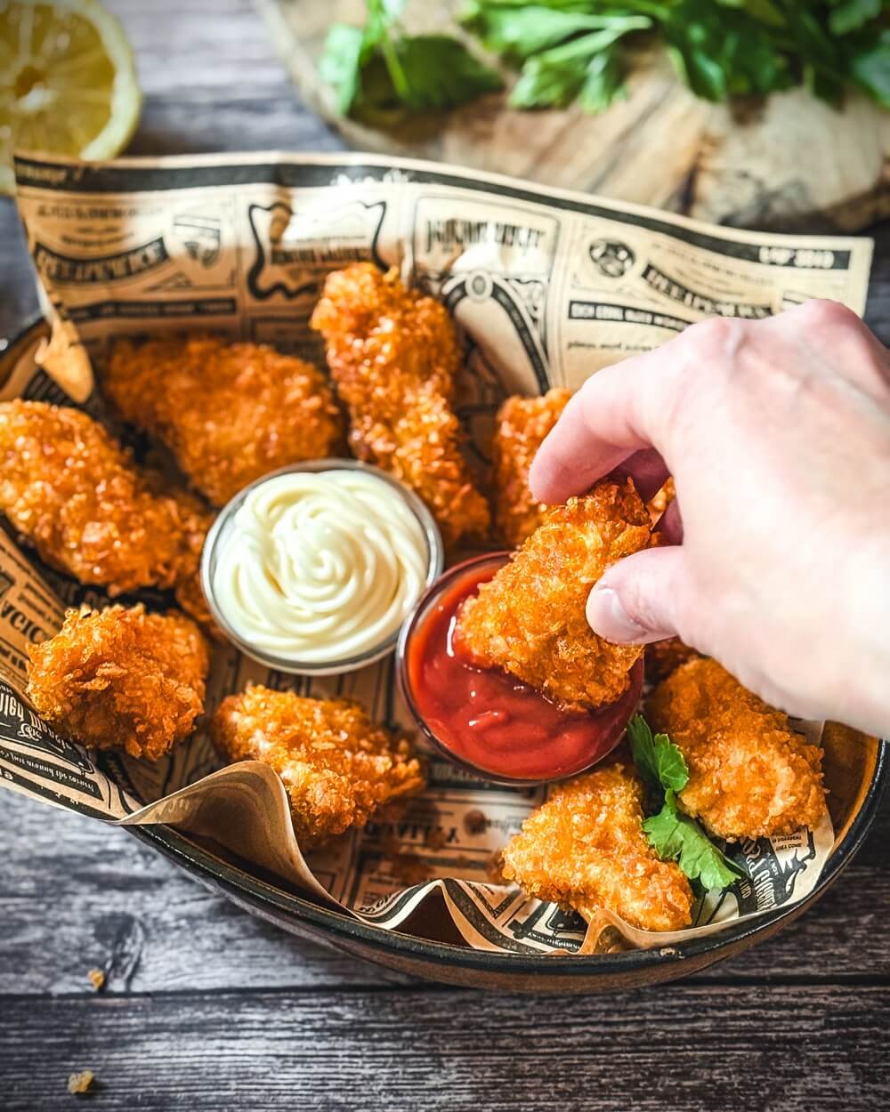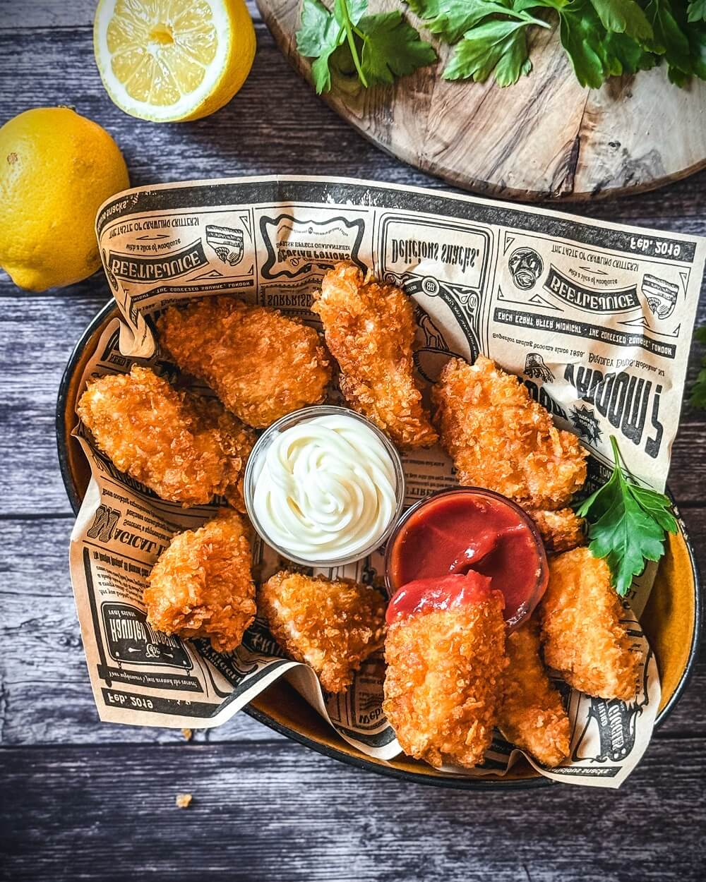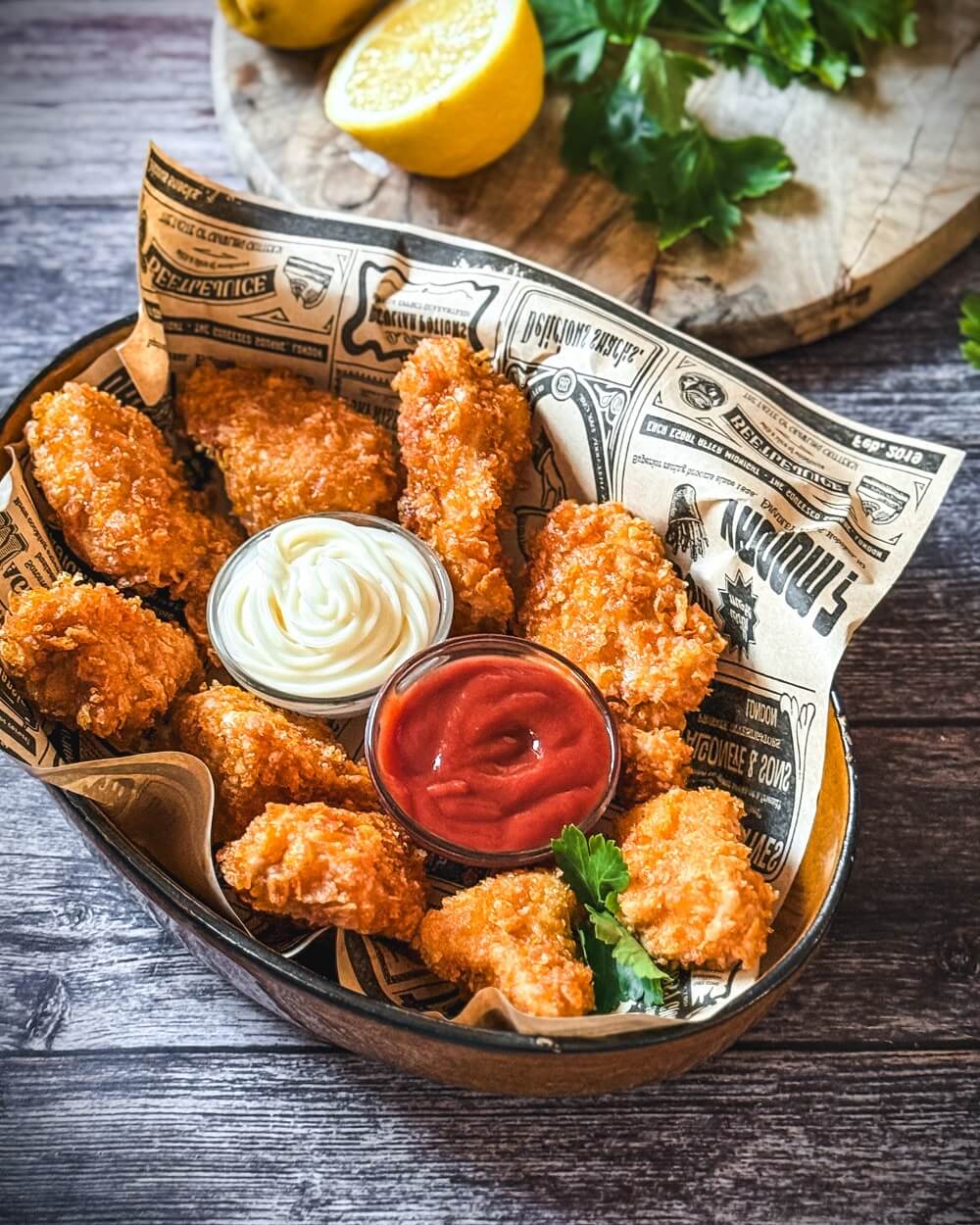 Wer übrigens auf dieses Rezept aber nicht aufs Frittieren im Fett steht: Chicken Nuggets aus der Heißluftfritteuse sind eine bisschen „leichter“…