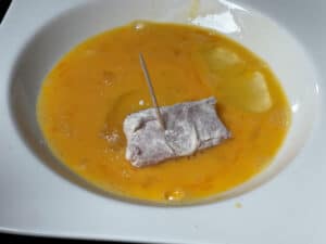 - Danach im verquirlten Ei benetzen. Tipp: Für diesen Schritt eignen sich Zahnstocher besonders gut, weil so deutlich weniger Panade an den Händen und Fingern kleben bleibt.