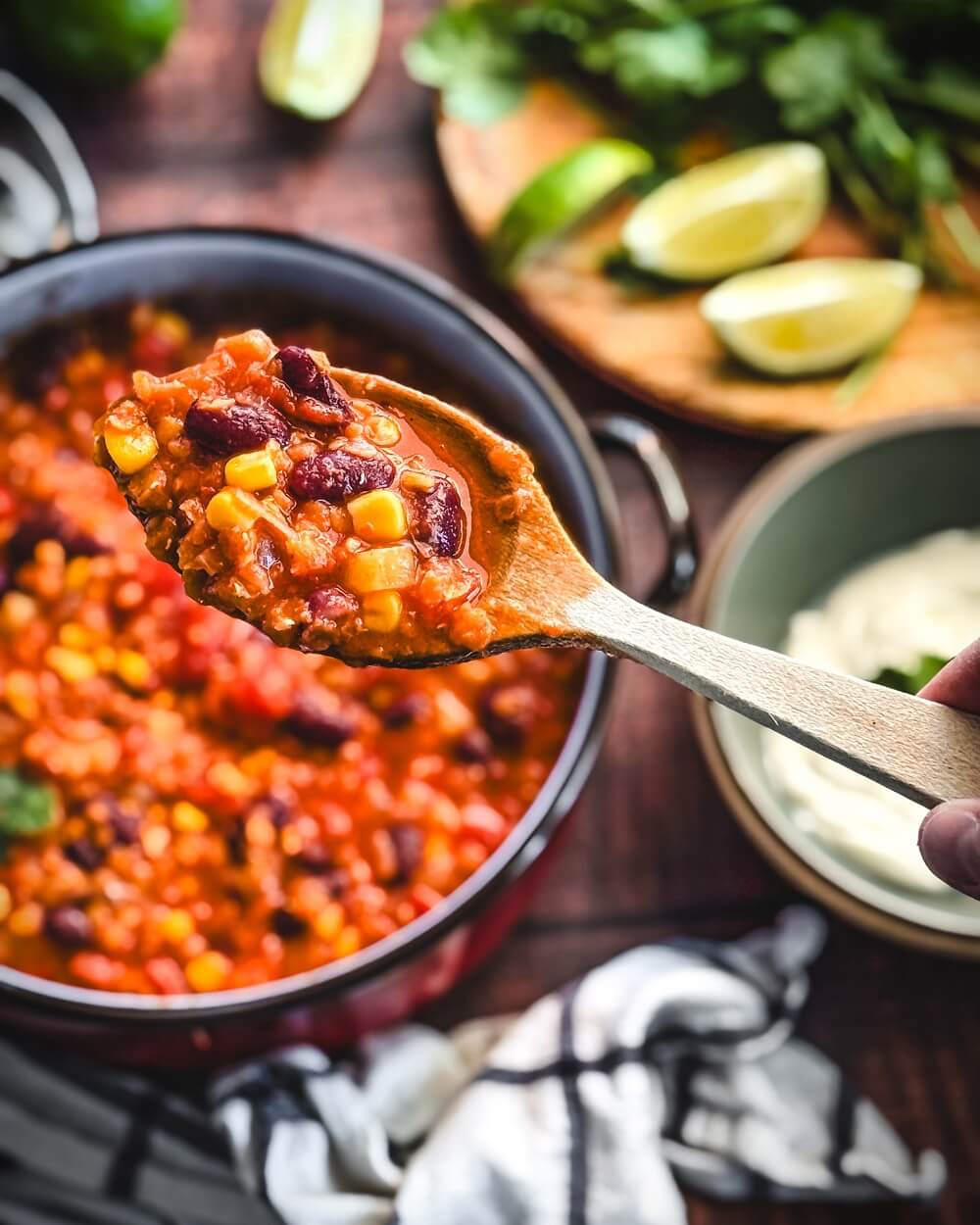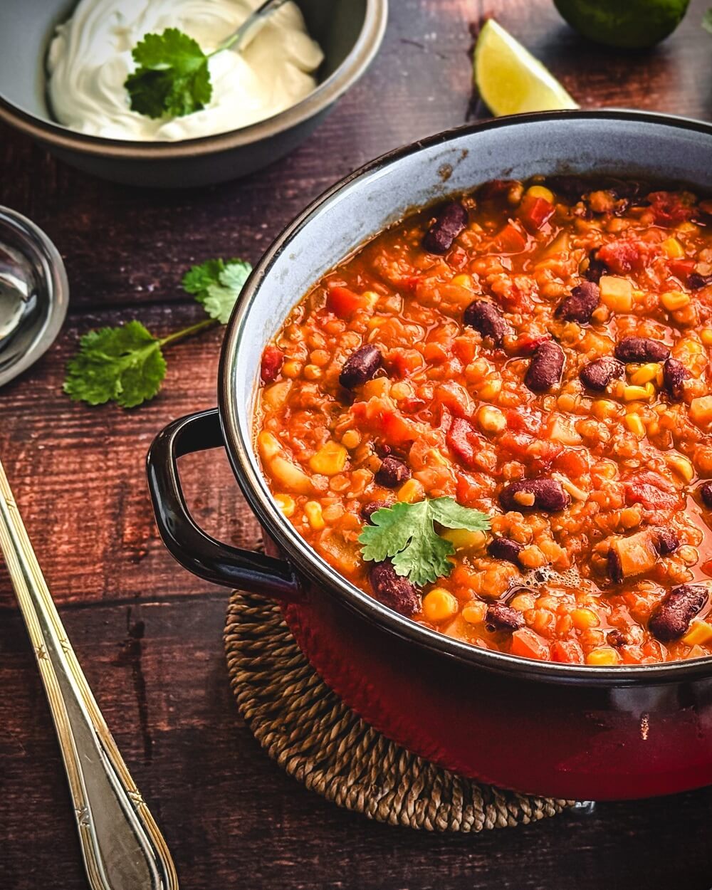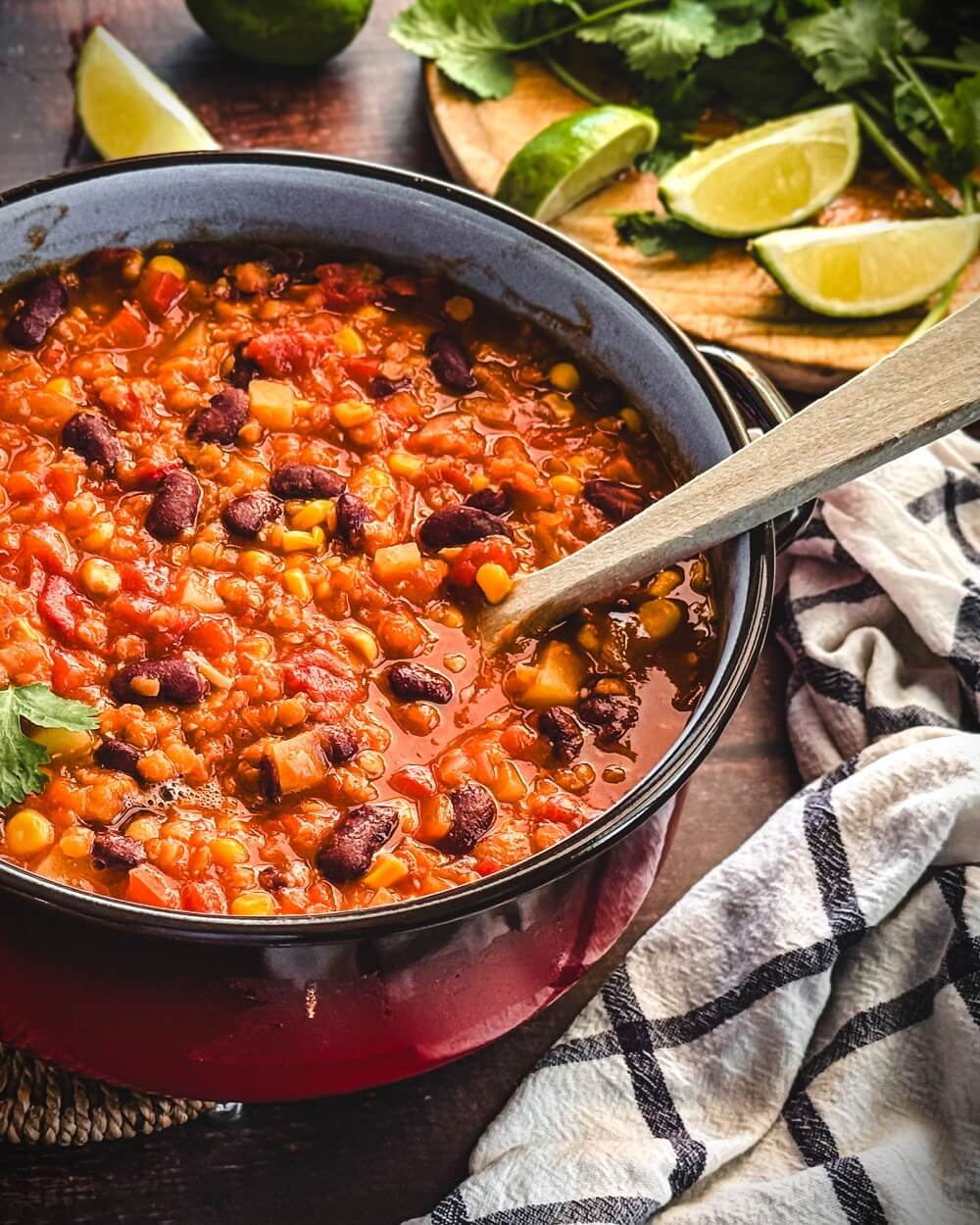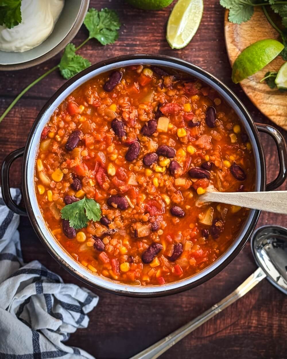 Als ich dieses Chili sin Carne das erste Mal probiert habe, hätte ich nicht gedacht, dass kein Fleisch drin ist. Die Linsen und das Gemüse sorgen für genau die kräftige, runde Art, die man von einem klassischen Chili con Carne kennt. Es fehlt nichts.