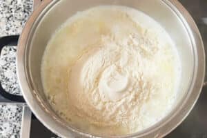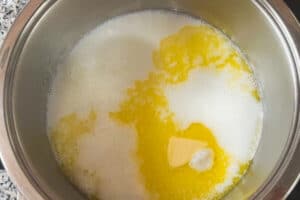 - Wasser, Milch, Butter, Zucker und Salz in einem Topf aufkochen lassen.