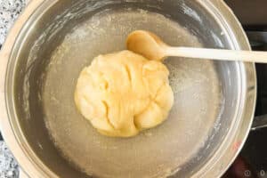 - Dann sofort mit einem Holzlöffel kräftig verrühren. Den Teigkloß so lange auf den Topfboden drücken, bis sich eine weiße Schicht bildet.