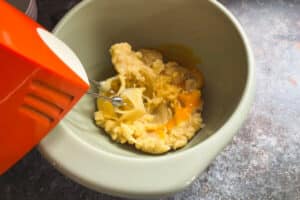 - Eier in einer kleinen Schüssel aufschlagen und nacheinander mit dem Handrührgerät (Schneebesenaufsatz, höchste Stufe) unter den Teig rühren, bis er glatt, glänzend und zäh ist.