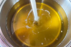 - Öl in einem breiten Topf auf ca. 170 °C erhitzen. Test: Holzkochlöffel ins Fett halten – bilden sich viele Bläschen, ist es heiß genug zum heraus backen.