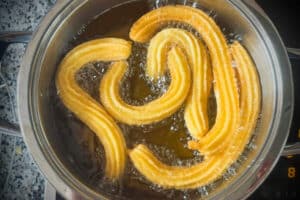 - Churros bei mittlerer Hitze von beiden Seiten je 2–3 Minuten goldbraun frittieren.