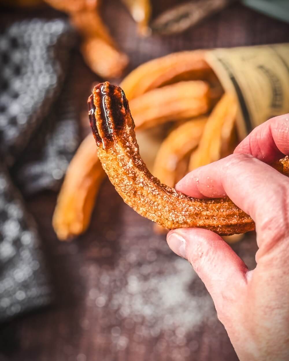- Die Churros noch warm entweder pur oder zum Beispiel mit Schokoladensoße servieren. Warmhalten im Ofen bei 50 Grad ist kein Problem. Viel Spaß beim Nachmachen und Guten Appetit. Bei einem Stück Genuss wird es dabei nicht bleiben, versprochen!