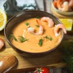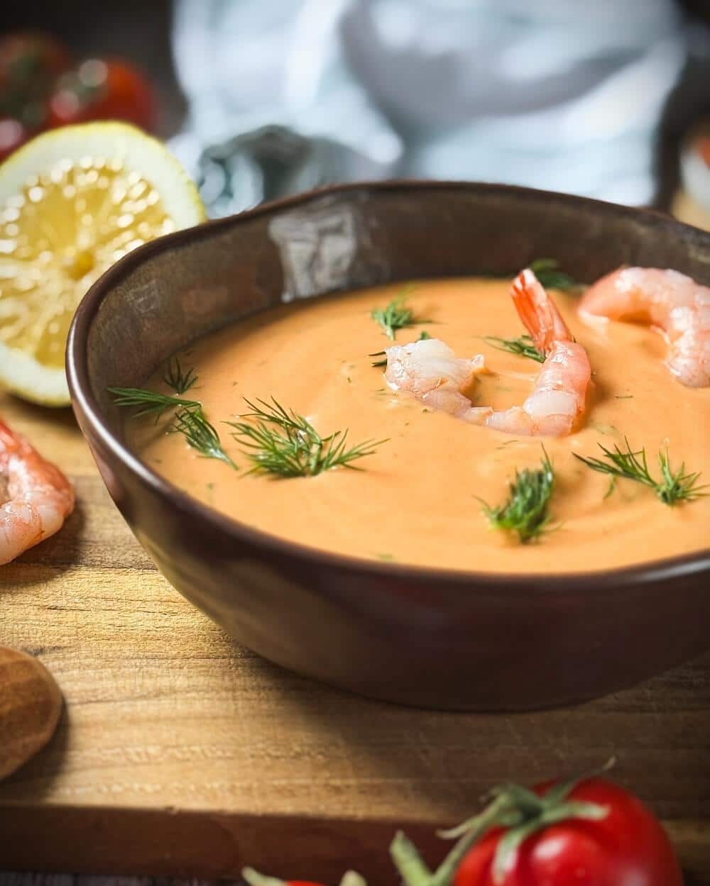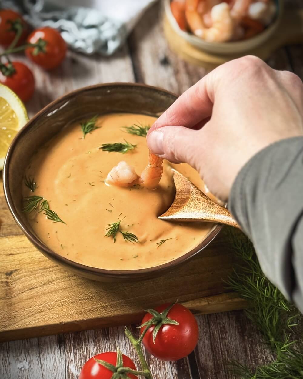 Cocktailsauce besteht klassisch aus Mayonnaise und Ketchup als Basis. Dazu kommen Zitronensaft, Worcestershire Sauce, etwas Sahne sowie Gewürze wie Paprikapulver. Je nach Rezept ergänzt frischer Dill den Geschmack.