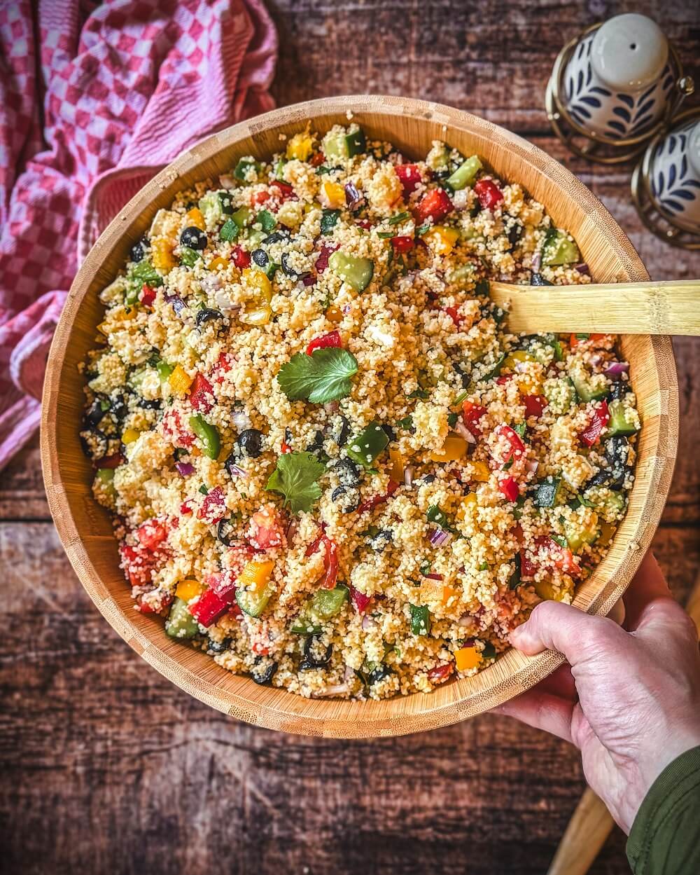 Ich mache ihn auch gerne, wenn nur für eine Person gekocht wird oder wenn etwas für die nächsten Tage vorbereitet sein soll. Als Meal Prep eignet sich Couscous Salat sehr gut, und mit einem leckeren Dip und etwas Brot daraus schnell ein unkompliziertes Abendessen.