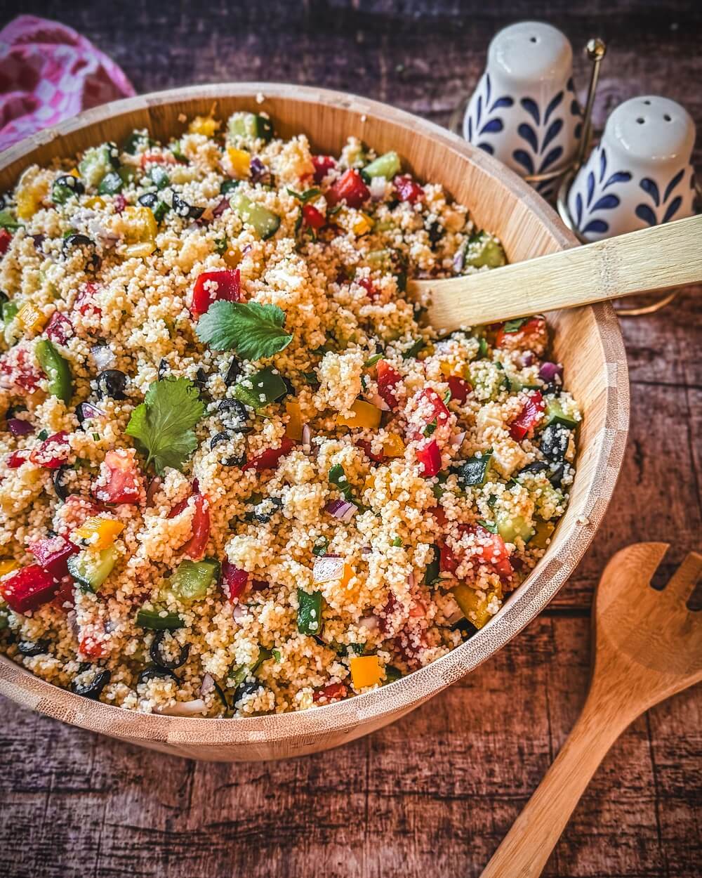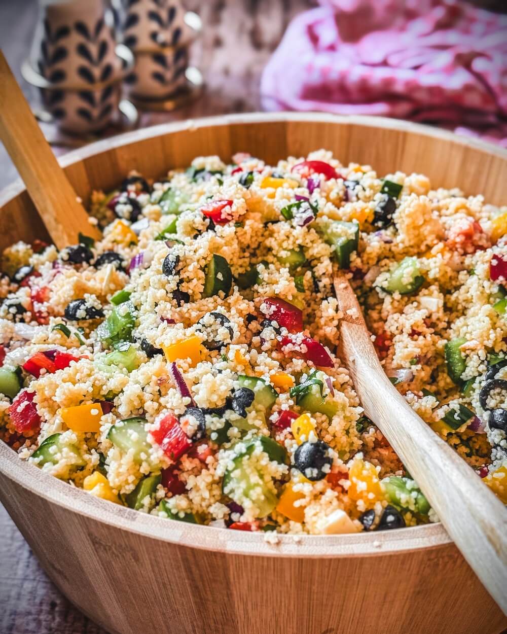 Auch für Buffets oder Feiern eignet sich Couscous Salat sehr gut. Er lässt sich problemlos in größeren Mengen zubereiten und bleibt lange angenehm saftig, sodass Gäste jederzeit zugreifen können.