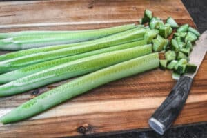 • Währenddessen die Salatgurke der Länge nach halbieren, dann vierteln und in kleine Scheiben schneiden.