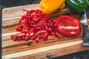 • Die Paprika putzen und in kleine Stücke schneiden.