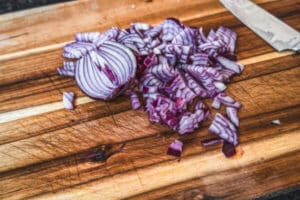 • Rote Zwiebeln und schwarze Oliven: Zwiebeln geben dem Salat eine leichte Schärfe, während Oliven eine würzige mediterrane Komponente beitragen. Beide Zutaten ergänzen das Gemüse und den Feta geschmacklich.
