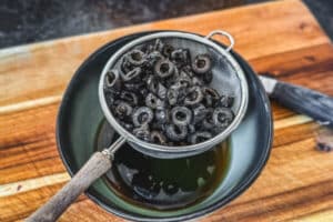 • Das Glas Olivenscheiben abgießen und abtropfen lassen.