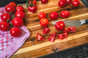 • Die Tomaten vom Strunk befreien und klein schneiden.