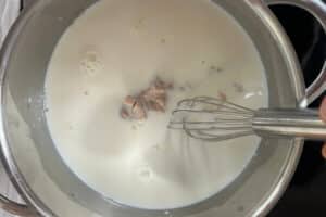- Für den Teig zuerst die Milch lauwarm erhitzen und die Hefe darin auflösen.