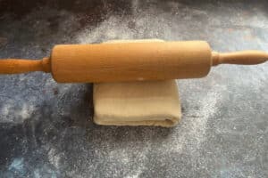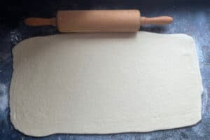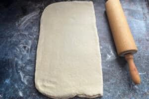 - Den gekühlten Teig auf einer leicht bemehlten Arbeitsfläche zu einem Rechteck von etwa 20 x 40 cm ausrollen.