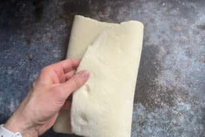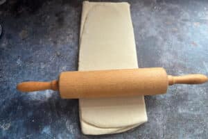 - Den Teig um 90 Grad drehen und erneut zu einem Rechteck ausrollen.