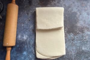 - Danach das rechte Drittel zur Mitte klappen, anschließend das linke Drittel darüberlegen. Erneut kühlen. Optional kann nach dem gleichen Prinzip eine vierte Tour durchgeführt werden.