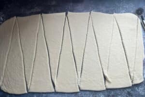 - Den Teig in Dreiecke schneiden, so dass 10 bis 12 längliche Dreiecke entstehen.
