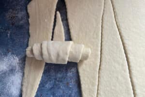 - Die Dreiecke von der breiten Seite her zur Spitze aufrollen und zu Croissants formen.