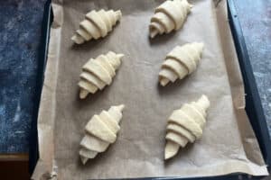 Ein weiterer Punkt ist die Gehzeit. Werden die geformten Croissants zu kurz gehen gelassen, bleiben sie kompakt und gehen im Ofen nicht richtig auf. Zu langes Gehenlassen ist allerdings ebenfalls ungünstig, weil die Butter dann schmelzen kann. Ein warmer, aber nicht heißer Ort ist ideal.