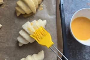 - Eigelb und Milch verquirlen und die Croissants vorsichtig damit bestreichen.