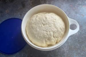 - Den Teig abgedeckt mit Folie oder einem Deckel eine Stunde an einem warmen Ort ruhen lassen. Anschließend für 30 Minuten in den Kühlschrank stellen.