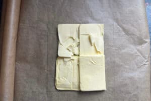 - Währenddessen die Butterplatte vorbereiten. Dafür die 250 g kalte Butter in grobe Stücke schneiden und auf einem Stück Backpapier zu einem Quadrat von etwa 20 x 20 cm anordnen.